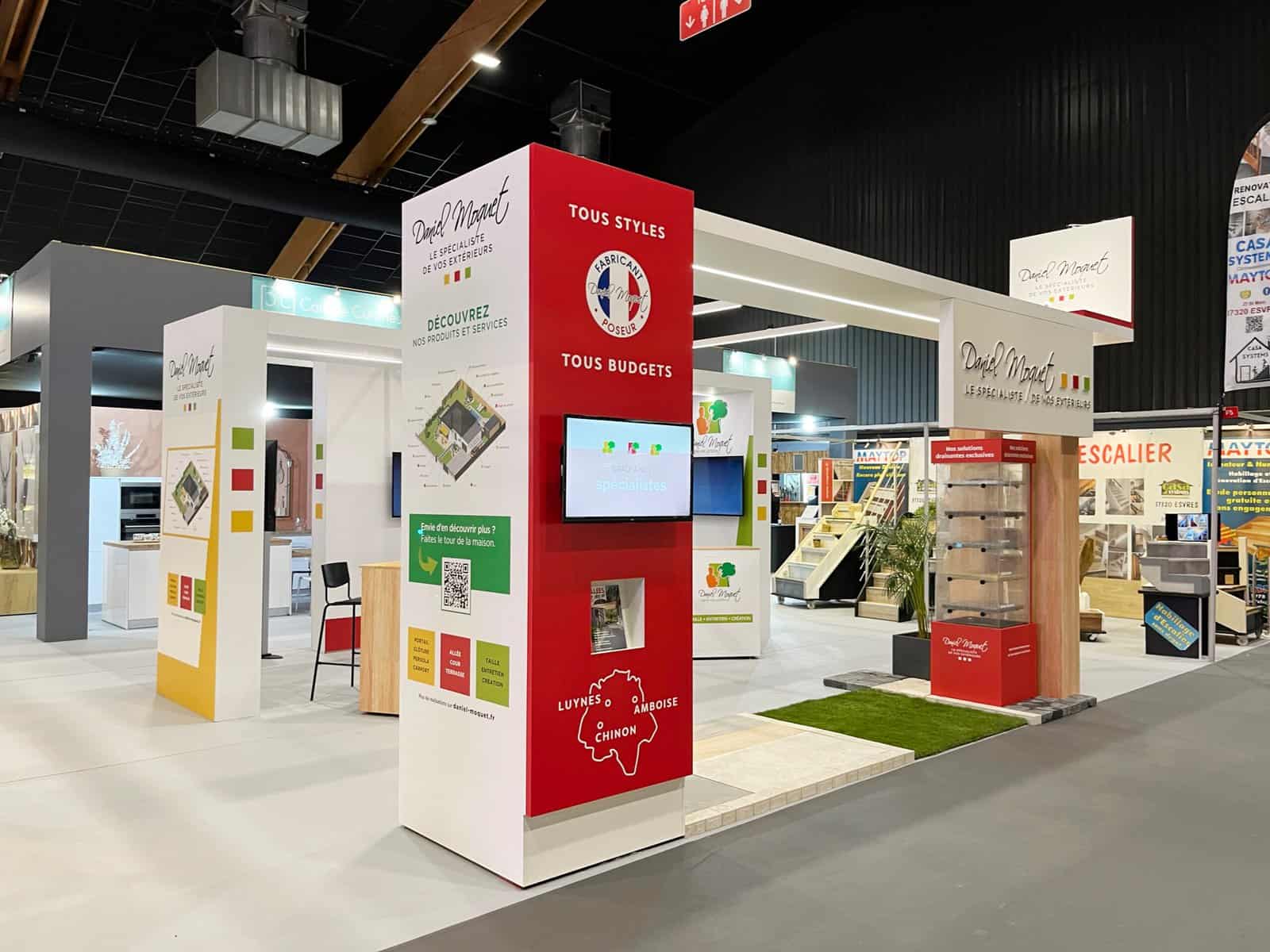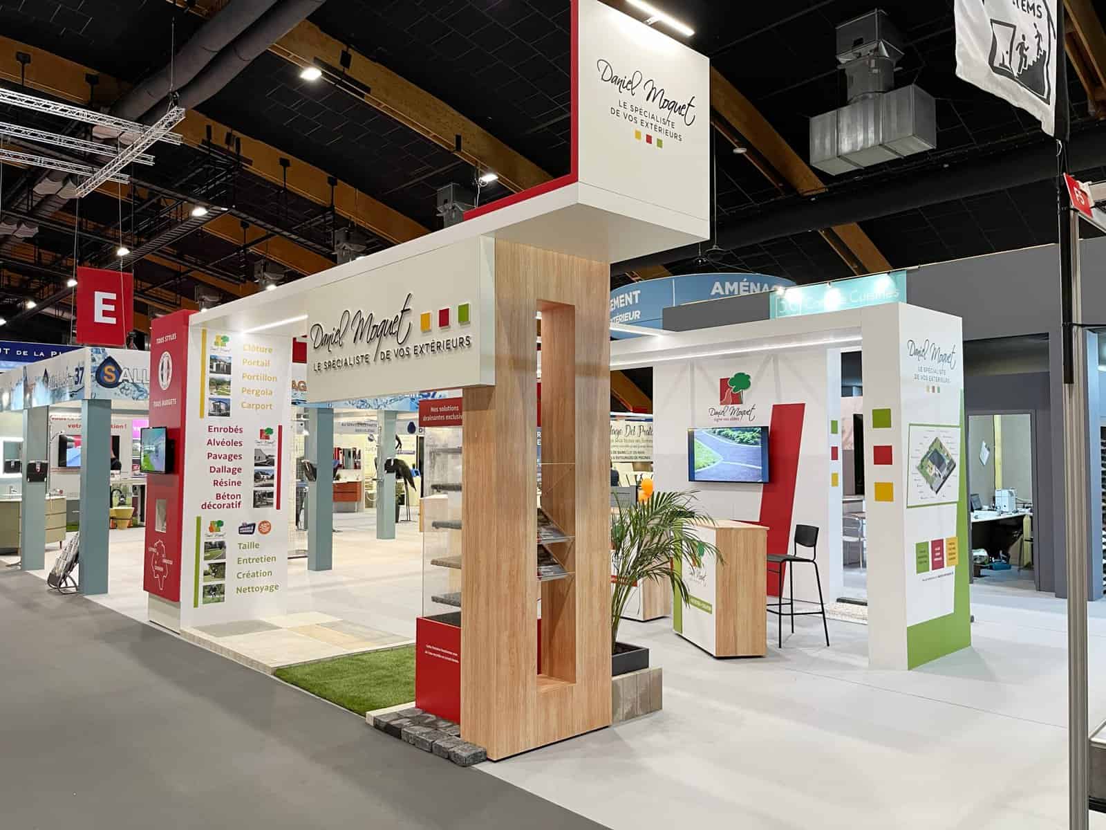 Dans le cadre d’un salon professionnel, l’enseigne Daniel Moquet souhaitait disposer d’un stand sur mesure capable de valoriser ses différentes solutions d’aménagement extérieur tout en offrant un espace d’accueil clair et structuré pour les visiteurs.