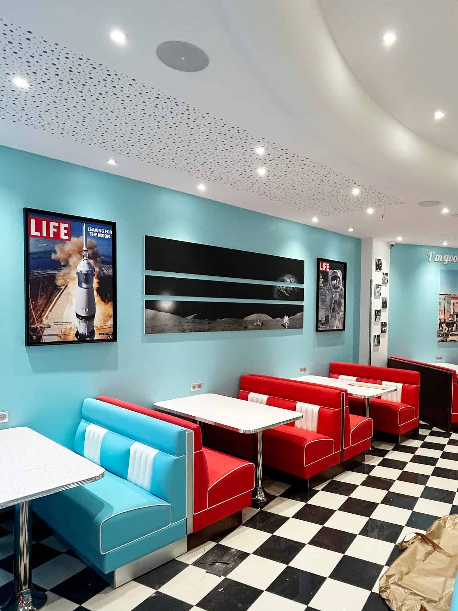 L’objectif est de créer une ambiance immersive inspirée de l’univers américain des années 50, tout en garantissant une cohérence visuelle entre les différents établissements de l’enseigne.