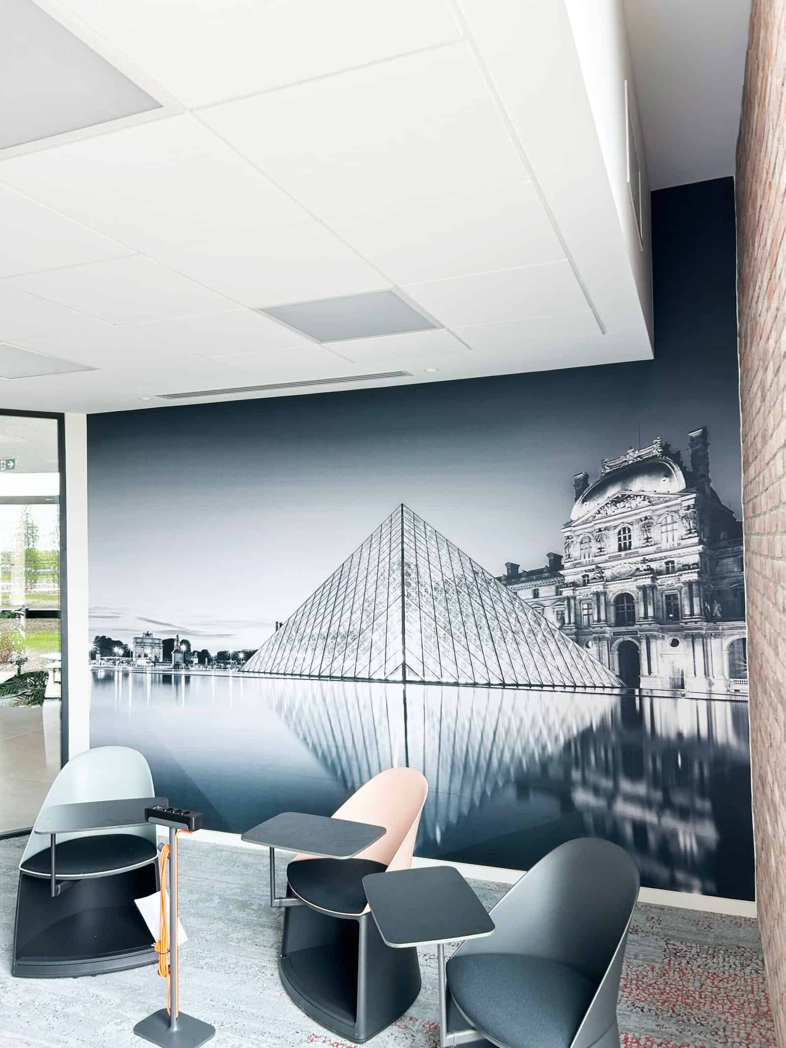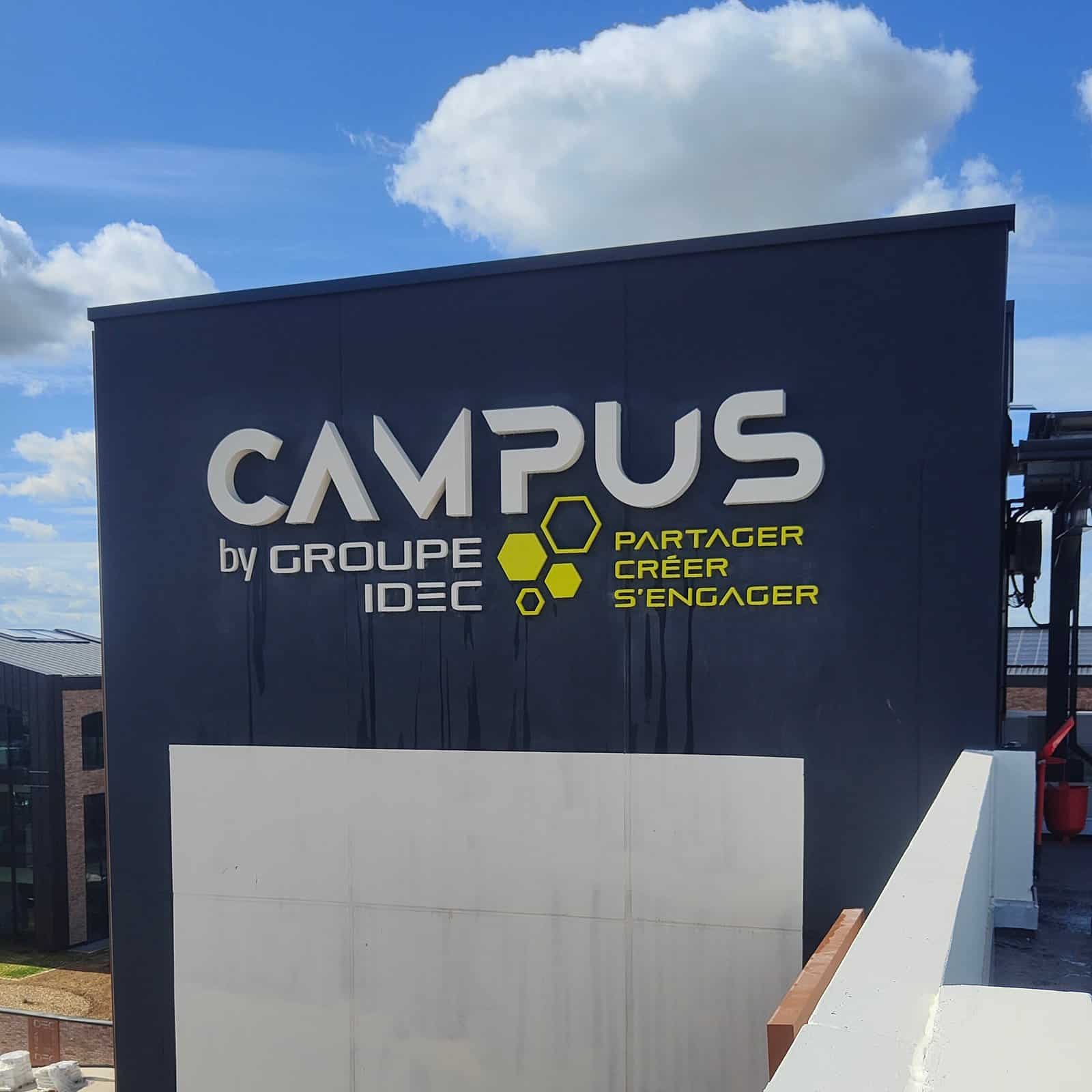 Les enseignes en lettres boîtiers assurent une identification claire du bâtiment en façade. Les adhésifs imprimés et découpés permettent d’habiller les murs, de structurer les espaces et d’apporter une dimension graphique forte aux différents lieux.